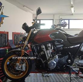 Progettiamo e Realizziamo avantreni speciali con forcelle ohlins e freni brembo, su misura per: cafe racer, scrambler, custom, streetfighter, superbike, prototipi, show bike, maxi enduro, off road, maxi scooter, brat. ESCLUSIVITA', PERFORMANCE, SICUREZZA ED ESTETICA AL TOP! PRESENTIAMO AVANTRENO SU MISURA PER HONDA CB 1300 ( su richiesta anche per qualsiasi altro modello), costituito da: - FORCELLE OHLINS CONVENTIONAL allestite su misura in base al progetto, modello TRADIZIONALE con stelo da 43mm (disponibili su richiesta anche OHLINS ROVESCIATE NIX SUPERBIKE oppure OHLINS ROVESCIATE R&T) - PIEDINI FORCELLE RADIALI ricavati dal pieno - KIT PIASTRE DI STERZO RICAVATE DAL PIENO SU MISURA - PINZE BREMBO RADIALI (vari mod. disp.) - STEFFE PARAFANGO RICAVATE DAL PIENO Optional: - COPPIA CERCHI RAGGI CNC - AMMORTIZZATORI POST. OHLINS - DISCHI BREMBO IL KIT MONTA PLUG AND PLAY SENZA MODIFICHE CON IL CERCHIO ORIGINALE HONDA. Piastre di sterzo speciali ricavate dal pieno con piastra inferiore a 3 punti di chiusura e piastra superiore con alloggio riser. Piastre con alleggerimenti. Per il montaggio delle piastre si utilizzano boccole e cuscinetti originali. Tutte le parti ricavate dal pieno possono essere anodizzate di qualsiasi colore. Le forcelle ohlins possono essere fornite con fodero anodizzato oro oppure anodizzato nero. Possiamo progettare e realizzare qualsiasi modifica su richiesta. Sulle piastre possiamo replicare attacchi e supporti presenti sul modello originale per telaietto, quadro strumenti, blocco accensione, blocca sterzo, ammortizzatore di sterzo, fari, oppure possiamo realizzare attacchi e supporti speciali su richiesta.