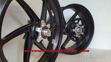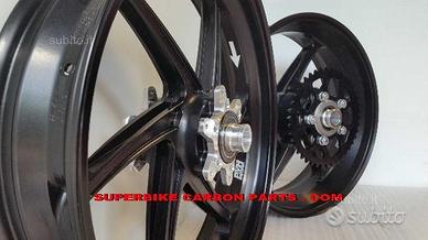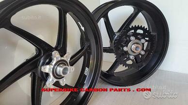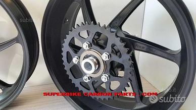 Cerchi PVM forgiati in alluminio versione a 6 razze LIGHTWEIGHT , rifiniti con macchinari a controllo numerico (CNC). DISPONIBILI PER TUTTE LE MOTO. PER CBR 1000 RR Solo 8,5 kg di peso per la coppia completa di mozzo portacorona, corona, boccole, flange pronta per il montaggio!! DISPONIBILI ANCHE IN MAGNESIO, PESANO SOLO 6,8 KG LA COPPIA!! Notate le razze molto lavorate e alleggerite con cave passanti. i pesi comunicati dalle altre case non sono in ordine di marcia ma il peso dei cerchi nudi, ne risulta che i cerchi Pvm sono i più leggeri al mondo. Campioni del mondo Superbike con il team Honda Ten Kate Racing. Plug & play con la moto originale. Forniti completi di valvole, distanziali e cuscinetti a seconda del modello di moto. Si può scegliere tra un supporto corona realizzato appositamente per il montaggio della corona originale o un supporto per corona racing molto più leggero (0,5 kg più leggero). In questo caso si deve montare una corona apposita. Verniciatura a polvere applicata elettrostaticamente ed indurita a caldo per una lunghissima durata nel tempo. Colori disponibili: nero, rosso, bianco, nero lucido, nero opaco, argento brillante (qualsiasi altro colore a pagamento). Vantaggi: riduzione del peso (1 Kg di peso tolto alle masse non sospese equivale in termini di prestazioni dinamiche ad un alleggerimento di circa 8 Kg del peso veicolo). Minor momento d'inerzia con conseguente guadagno in stabilità e rapidità. Centralizzazione delle masse. Possibilità di ritardare la staccata ed anticipare la riapertura del gas. Maneggevolezza sconvolgente. Maggior accelerazione. Estrema facilità nel raggiungere e tenere il punto di corda.