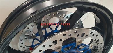 SET CERCHI RUOTE PVM UFFICIALI WORLD SUPERBIKE 2024 2025 GLI STESSI UTILIZZATI DAL TEAM BMW UFFICALE SBK CAMPIONE DEL MONDO 2024 CON TROPRAK RAZGATLIOGLU. Specifici per: HONDA CBR 600 RR 2007 2024 anche versione ABS Alluminio forgiato. PLUG AND PLAY SI MONTANO SENZA MODIFICHE COMPLETI DI LAVORAZIONE ANTISLIP SUL CANALE. QUESTO TRATTAMENTO IMPEDISCE ALLA GOMMA DI "GIRARE SUL CERCHIO" EVITANDO COSI' PERICOLOSI ONDEGGIAMENTI E MIGLIORANDO IL FEELING NELLE FASI DI ACCELERAZIONE E FRENATA. I cerchi sono anodizzati nero e questo offre una durata nel tempo e una resistenza impossibile con la normale verniciatura. Set costituito da: -Coppia cerchi pvm forgiati modello 5Y -Dischi racing RM2 full flottanti 320 x 5,5mm made in italy, completi di distanziali pinze (UPGRADE rispetto ai 310mm originali) -mozzo porta corona -corona alleggerita in ergal passo 520 -valvole a 90° IL SET CERCHI GARANTISCE L'OTTENIMENTO DI UNA MANEGGEVOLEZZA ELEVATISSIMA A TUTTO VANTAGGIO DI CAMBI DIREZIONE RAPIDISSIMI CON LA POSSIBILITA' DI RITARDARE AL MASSIMO LA STACCATA CON INGRESSI IN CURVA FULMINEI. La coppia di dischi prodotta da RM2 è full flottante, campana in ergal alleggerita e anodizzata e pista frenante da 320mm x 5,5mm di spessore, che permettono UN IMPORTANTE UPGRADE rispetto ai dischi originali da soli 310mm. I dischi sono full flottanti quindi garantiscono un perfetto accoppiamento con la pastiglia freno per una frenata immediata senza ritardi ed efficace. I dischi annullano il fastidioso fenomeno fading, ovvero quando all'aumentare delle temperature di esercizio la pompa freno diventa spugnosa e si "allunga" la corsa . La pista frenante racing con speciale lavorazione del profilo a cuspide offre una perfetta resa della pastiglia freno. I DISCHI GARANTISCONO UNA POTENZA FRENANTE NOTEVOLMENTE AUMENTATA A PARITA' DI PRESSIONE SULLA LEVA.