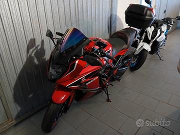 tutte le parti di carene nera sostituite con fibra in vetro finitura carbonio, sella originale Honda CBR in gel trapuntata rossa e scritta Honda, specchietti in carbonio con indicazione di direzione a freccia interna, contamarce, presa usb, porta cellulare, porta cupolino in fibra e cupolino fume, manopole puig ergonomiche in spugna e relativi contrappesi più leggeri e in tinta, leve antirottura, scarico akaprovic centralina dedicata, pedane posteriori sostituite come da foto, telaio e relativo bauletto, paramotore puig, proteggi radiatore, batteria al litio, telecamera con registrazione zona anteriore e posteriore che funge anche da reteovisore indicando pressione pneumatici velocita gps e registrazione su sche sd, strumentazione che indica angolo di piega, posizione GPS, velocità GPS tensione batteria, direzione cadinale, tanti dettagli in ergal ,Pneumatici metzeler Roadtec 02 adattivi appena sostituiti, proteggi serbatoio incluso anche sul tappo carburante, grip laterali per serbatoio