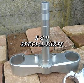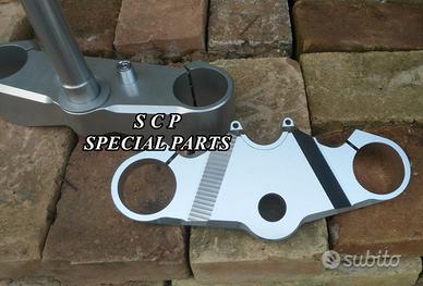 PROTOTIPIAMO E RALIZZIAMO PIASTRE DI STERZO RICAVATE DAL PIENO CON MACCHINARI A CONTROLLO NUMERICO PER QUALSIASI MOTO E PER REALIZZAZIONI SPECIALI. PRESENTIAMO PIASTRE DI STERZO RICAVATE DAL PIENO PER HONDA CBR 954 CBR 929 Il kit piastre è costituito da: piastra di sterzo inferiore con asse canotto e piastra di sterzo superiore. semimanubri disponibili su richiesta. Sovradimensionate con inferiore da 60 mm a 3 punti di chiusura oppure disponibile da 80 mm a 4 punti di chiusura E IN PARTICOLARI CASI SU RICHIESTA POSSIAMO REALIZZARELE DA 100mm 5 PUNTI DI CHIUSURA. Su richiesta forniamo anche il kit OFF SET VARIABILE costituito da boccole eccentriche che ne permettono al modifica MILLIMETRICA . Per il montaggio si utilizzano boccole e cuscinetti originali. Sono plug & play, si montano senza modifiche sulla moto stradale. Possiamo realizzare cave di alleggerimento anche passanti e altre lavorazioni meccaniche su richiesta. Un prodotto rivoluzionario per efficacia, risorse tecniche e costo contenuto. Possibilità di scegliere qualsiasi colore per l'anodizzazione. Le piastre di sterzo sono progettate appositamente per migliorare il feeling con l'avantreno eliminando il chattering rendendo la moto piu' stabile e granitica in inserimento curva e in percorrenza. La lega speciale utilizzata è testata in pista nei principali campionati internazionali e studiata appositamente per assorbire le sollecitazioni e permettere alle sospensioni di lavorare molto meglio. Replichiamo attacchi e supporti originali per telaietto, quadro strumenti, blocco accensione, blocca sterzo, ammortizzatore di sterzo etc, se richiesto, oppure ne produciamo di nuovi su specifica. Può essere scelta qualsiasi tipologia, forma e lavorazione meccanica o estetica per il progetto delle piastre di sterzo entro i limiti imposti dalla quote della moto stessa, prendendo spunto dai nostri lavori precedentemente effettuati. Finitura superficiale e anodizzazione di qualsiai colore.