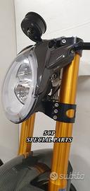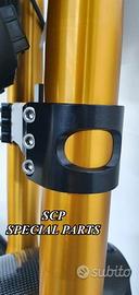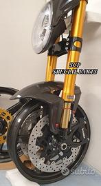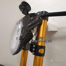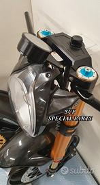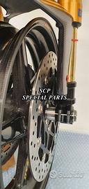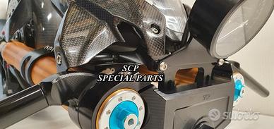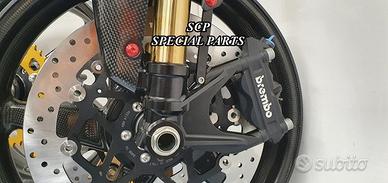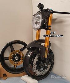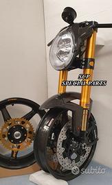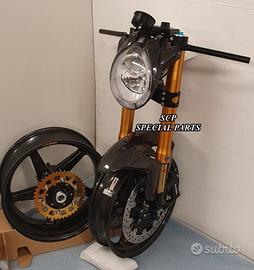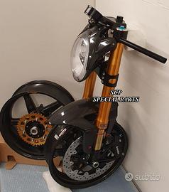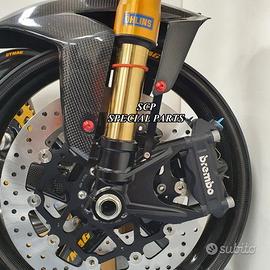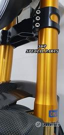 Progettiamo e Realizziamo avantreni speciali con forcelle ohlins su misura per: cafe racer, scrambler, custom, streetfighter, superbike, prototipi, show bike, maxi enduro, off road. PRESENTIAMO AVANTRENO COMPLETO SPECIFICO PER HONDA CBX 1000 CBX 1100 ( su richiesta anche per altri modelli), costituito da: - FORCELLE OHLINS allestite su MISURA in base al progetto, modello R&T con stelo da 43mm e fodero da 56mm (disponibili su richiesta anche OHLINS NIX SUPERBIKE) - PIEDINI FORCELLE RADIALI RICAVATI DAL PIENO - PIASTRE DI STERZO RICAVATE DAL PIENO SU MISURA - STAFFE SUPPORTO FARO E CRUSCOTTO RICAVATE DAL PIENO - SEMIMANUBRI RACING RICAVATI DAL PIENO - PINZE BREMBO RADIALI - DISCHI BREMBO da 320mm - PARAFANGO CARBONIO - PERNO RUOTA E STAFFE PARAFANGO RICAVATE PIENO - MASCHERINE FARO IN CARBONIO - CERCHI IN CARBONIO IL KIT E' PLUG AND PLAY! SI MONTA SENZA NESSUNA MODIFICA! ANCHE CON CERCHIO ORIGINALE. ESCLUSIVITA', SICUREZZA, GUIDABILITA', CONFORT ED ESTETICA AL TOP! Piastre di sterzo speciali ricavate dal pieno e sovradimensionate con piastra inferiore da 60 mm di spessore a 3 punti di chiusura. Disponibile anche da 80mm o 95mm a 4 punti. Piastra di sterzo superiore e kit manubri sportivi ricavati dal pieno. Su richiesta realizziamo riser ricavati dal pieno per utilizzo di manubrio naked. Per il montaggio si utilizzano boccole e cuscinetti originali. Tutte le parti ricavate dal pieno possono essere anodizzate di qualsiasi colore. Le forcelle ohlins possono essere fornite con fodero anodizzato oro oppure anodizzato nero. Possiamo progettare e realizzare qualsiasi modifica su richiesta. Sulle piastre possiamo replicare attacchi e supporti presenti sul modello originale per telaietto, quadro strumenti, blocco accensione, blocca sterzo, ammortizzatore di sterzo, fari, etc. Oppure possiamo realizzare attacchi e supporti speciali su richiesta. Possiamo fornire come optional: cerchi a raggi su misu