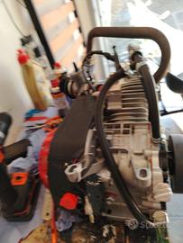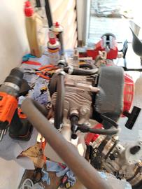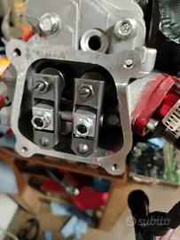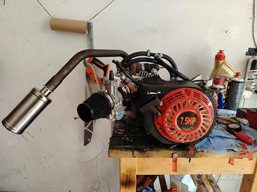 Vendo un motore honda gx 200, più o meno 16-18cavalli con le seguenti modifiche:Biella in alluminio billet, pistone flat top con la verniciatura ceramica, volano in alluminio pressofuso, coperchio laterale in alluminio billet con doppio cuscinetto e ventilazione dei gas di blow-by, testata in alluminio pressofuso con camera di combustione da 18cc e valvola aspirazione grande, condotti di aspirazione e scarico più grandi, molle delle valvole da 37libbre, bilancieri champions, coperchio valvole in alluminio billet con ventilazione dei has blow by collegato al Carter, carburatore pwk 34 keihin, scarico prestazionale con silenziatore rimovibile, aste per l'alzata dei bilancieri in cromolio, sostituzione dell'albero a camme originale di plastica con uno di acciaio, frizione a centrifuga #428 da 13 denti, wrap in fibra di carbonio, rimozione del limitatore meccanico, rimozione sensore dell'olio basso, foro di ritorno dell'olio allargato a 6 mm e candela ngk con elettrodo in iridio. È tutto nuovo e in perfette condizioni, ho avvitato tutti i bulloni più importanti con la chiave dinamometrica e ho trattato tutto con delicatezza e molta attenzione nel mentre che montavo tutti i pezzi e il rapporto di compressione si dovrebbe aggirare intorno al 11.5:1, posso anche fornire altre foto o informazioni sul motore..