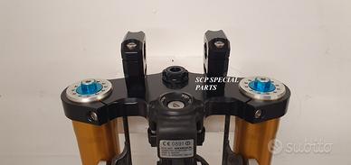 Piastre di sterzo speciali ricavate dal pieno e sovradimensionate con piastra inferiore da 60 mm a 6 punti di chiusura con alleggerimenti passanti laterali.