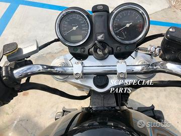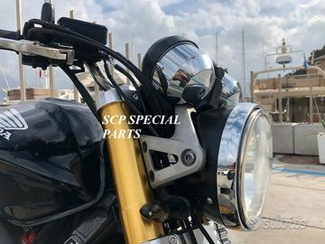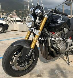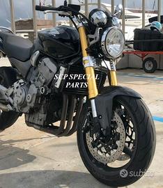 Progettiamo e Realizziamo avantreni speciali con forcelle Ohlins oppure Marzocchi e freni Brembo, su misura per: cafe racer, scrambler, custom, streetfighter, superbike, prototipi, show bike, maxi enduro, off road, maxi scooter, brat. ESCLUSIVITA', PERFORMANCE, SICUREZZA ED ESTETICA AL TOP! PRESENTIAMO AVANTRENO SU MISURA PER HONDA HORNET 900 ( su richiesta anche per qualsiasi altro modello), costituito da: - FORCELLE MARZOCCHI RAC 50 assiali, su richiesta anche radiali, con fodero da 58mm e steli da 50mm completamente regolabili, oppure forcelle OHLINS disponibili nel modello NIX SUPERBIKE con stelo da 43mm, oppure R&T NIX con stelo da 48mm e fodero da 58mm - PIEDINI FORCELLA ASSIALI oppure su richiesta RADIALI, anche ricavati dal pieno con macchinari cnc. - KIT PIASTRE DI STERZO RICAVATE DAL PIENO SU MISURA complete di tutti gli attacchi originali - SUPPORTI FARO E SUPPORTI CRUSCOTTO RICAVATI DAL PIENO - RISER MANUBRIO OPPURE COPPIA SEMIMANUBRI RICAVATI DAL PIENO - PINZE BREMBO ASSIALI oppure radiali (vari mod. disp.) - DISCHI BREMBO MAGGIORATI da 320mm (vari mod. disp.) - PARAFANGO CARBONIO - PERNO RUOTA, STAFFE PARAFANGO TUTTO RICAVATO DAL PIENO Optional: - COPPIA CERCHI RAGGI - AMMORTIZZATORE POST. OHLINS - POMPA FRENO BREMBO IL KIT MONTA PLUG AND PLAY SENZA MODIFICHE ANCHE CON IL CERCHIO ORIGINALE HONDA. Tutte le parti ricavate dal pieno e anche i foderi forcelle possono essere anodizzate di qualsiasi colore su richiesta. Piastre di sterzo speciali ricavate dal pieno e sovradimensionate con piastra inferiore da 80 mm a 8 punti di chiusura con alleggerimenti passanti laterali. Piastra di sterzo superiore maggiorata con alleggerimenti e riser . Per il montaggio delle piastre si utilizzano boccole e cuscinetti originali. Possiamo progettare e realizzare qualsiasi modifica su richiesta. Sulle piastre possiamo replicare attacchi e supporti presenti sul modello originale oppure possiamo realizzare at