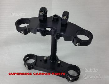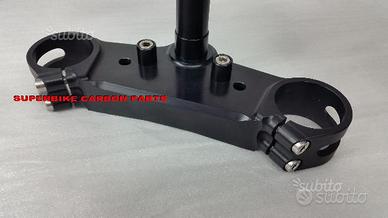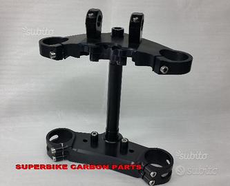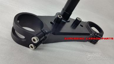 Kit costituito da: piastra di sterzo inferiore con asse canotto e piastra di sterzo superiore completa di Riser . Possibilità di averle Sovradimensionate con piastra inferiore da 60 mm a 3 punti di chiusura oppure disponibile da 80 mm a 4 punti di chiusura. In particolari casi possiamo produrle anche con piastra inferiore a 5 punti di chiusura. Piastra superiore con alloggio per riser e riser. Per il montaggio si utilizzano boccole e cuscinetti originali. Sono plug & play, si montano senza modifiche. Possiamo realizzare cave di alleggerimento e altre lavorazioni meccaniche su richiesta. Un prodotto rivoluzionario per efficacia, risorse tecniche e costo contenuto. Le piastre di sterzo sono progettate appositamente per migliorare il feeling con l'avantreno eliminando il chattering rendendo la moto piu' stabile in inserimento curva e percorrenza. La lega speciale utilizzata è testata in pista nei principali campionati internazionali e studiata appositamente per assorbire le sollecitazioni e permettere alle sospensioni di lavorare molto meglio. Realizzate con Off set standard oppure speciale o regolabile a richiesta. Replichiamo tutti gli attacchi e supporti originali per telaietto, quadro strumenti, blocco accensione, blocca sterzo, ammortizzatore di sterzo etc... oppure ne produciamo su richiesta. Il cliente può scegliere qualsiasi tipologia, forma e lavorazione per il progetto, entro i limiti imposti dalla quote della moto stessa, prendendo spunto dai nostri lavori precedentemente effettuati. Finitura superficiale e anodizzazione di qualsiai colore. Il kit è corredato ove necessario anche da un kit speciale di perno ruota boccole e flange. Progettiamo e produciamo piastre anche per realizzazioni speciali e sostituzioni forcelle originali con altre aftermarket.