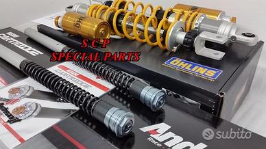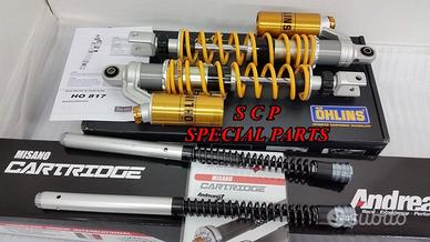 HONDA SH 300 KIT COMPLETO DELLE SOSPENSIONI COSTITUITO DA AMMORTIZZATORI POSTERIORI OHLINS E CARTUCCE FORCELLE ANDREANI AMMORTIZZATORI POSTERIORI OHLINS PRESSURIZZATI REGOLABILI NEL PRECARICO COMPRESSIONE ESTENSIONE GLI AMMORTIZZATORI OHLINS PERMETTONO UN INCREMENTO NOTEVOLE DELLA SCUREZZA DEL CONFORT E DELLA GUIDABILITA' KIT CARTUCCE ANDREANI DA INSTALLARE SULLE FORCELLE ORIGINALI HONDA PER MIGLIORARNE IL RENDIMENTO, IL CONFORT E RENDERLE REGOLABILI KIT COMPLETO DI MOLLE MODELLO CARTUCCE ANDREANI "MISANO" TARATURA PERSONALIZZATA COMPRESA