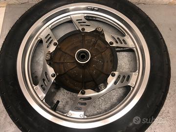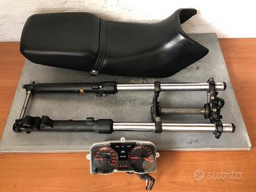 statore, carter, collettori aspirazione, motorino avviamento, centralina, regolatore tensione, bobine, clacson, ventola, radiatore, vaschetta espansione, sensore, faro, fanale, frecce (solo gemme), specchietto, cavi acceleratore, semimanubri, fianchetti post, rubinetto, sella (perfetta), parafango ant, sottosella, portatarga, forcella, steli, piastra superiore, cannotto sterzo, cerchio ant e post, dischi freno, corona, pignone, catena, attuatore frizione, poggiapiedi pilota e passeggero con staffe, pedalina cambio e freno, cavalletto laterale e centrale, collettori scarico, cassa filtro aria e bulloneria originale.