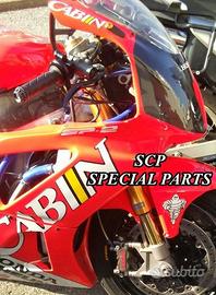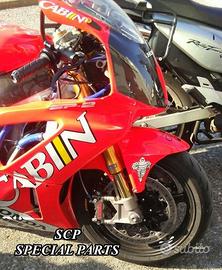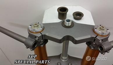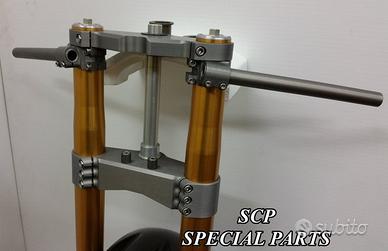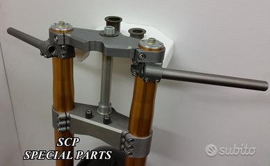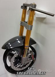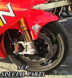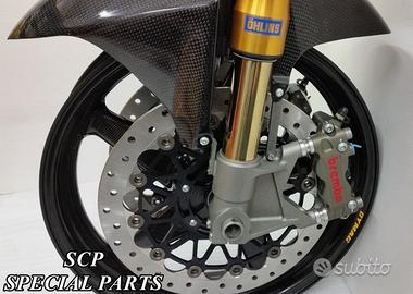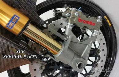 PROTOTIPIAMO E REALIZZIAMO AVANTRENI COMPLETI SU MISURA PER QUALSIASI MOTO. PRESENTIAMO AVANTRENO COMPLETO PER HONDA VTR SP1 SP2 CON FORCELLE OHLINS NIX, PIASTRE DI STERZO RICAVATE DAL PIENO CON OFFSET REGOLABILE, PIEDINI RADIALI RICAVATI DAL PIENO, PINZE DISCHI E POMPA FRENO BREMBO SUPERBIKE. IL TUTTO CORREDATO DA CERCHI IN CARBONIO!!!! TUTTO QUESTO LO POSSIAMO REALIZZARE SU MISURA PER QUALSIASI MOTO!!! IL KIT E' PLUG AND PLAY! SPECIFICO! SI MONTA SENZA NESSUNA MODIFICA! Kit costituito da: Forcelle OHLINS NIX 30 (OPTIONAL DISPONIBILI OHLINS NXP PRESSURIZZATE O OHLINS R&T), le forcelle sono ALLESTITE SPECIFICATAMENTE NELLA TARATURA per ogni modello di moto. Le forcelle sono corredate da piedini radiali ricavati dal pieno e impianto freni completo BREMBO (qui in foto versione Superbike con pinze gp4 cnc pista bassa, dischi full float 6mm sbk, pompe cnc), piastre di sterzo speciali ricavate dal pieno con offset regolabile e sovradimensionate con piastra inferiore da 60 mm a 3 punti. Semimanubri ricavati dal pieno. Parafango in carbonio e kit perno ruota ricavato dal pieno. Per il montaggio si utilizzano boccole e cuscinetti originali. Il cerchio è su misura per VTR SP realizzato in carbonio. Possiamo progettare e realizzare qualsiasi specifica atta a rendere unica tale tipologia di prodotto. Tutte le parti ricavate dal pieno possono essere progettate e realizzate direttamente su specifiche tecniche ed estetiche del cliente. Sulle piastre possiamo replicare attacchi e supporti originali per telaietto, quadro strumenti, blocco accensione, blocca sterzo, ammortizzatore di sterzo etc oppure possiamo farne di nuovi su richiesta. TUTTO L'AVANTRENO E' PROGETTATO APPOSITAMENTE PER RENDERE LA CICLISTICA DELLA VOSTRA MOTO COME QUELLA DI UNA SUPERBIKE!!! PERFORMANCE, QUALITA', ESCLUSIVITA' AI MASSIMI LIVELLI.