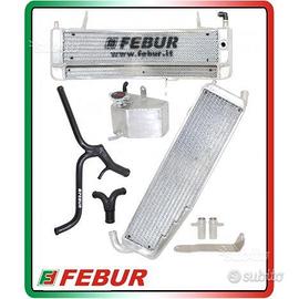 I radiatori Febur Radiators abbassano notevolmente la temperatura grazie alla maggiore superficie di massa radiante, qualità dei materiali e attento studio e progettazione per raggiungere le migliori prestazioni, considerate che ad elevate temperature il motore perde sempre più potenza, inoltre con il nostro radiatore la temperatura rimane più costante e senza sbalzi. Il kit comprende il radiatore con tappo e i tubi di connessione in alluminio I radiatori necessitano l'abbinamento con carene da pista e scarico racing