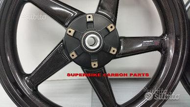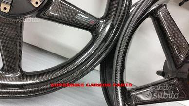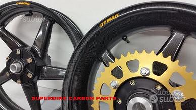 HONDA VTR SP 1 E SP 2, CERCHI DYMAG IN CARBONIO. DISPONIBILI ANCHE PER QUALSIASI ALTRA MOTO. Disegno a cinque razze che contribuisce a renderli allo stesso tempo solidi e leggerissimi - oltre che spettacolari. Il risparmio di peso rispetto ai cerchi originali è abissale, ma anche rispetto ai cerchi in magnesio di altri produttori. Pensate che la coppia di cerchi in carbonio pronta per il montaggio con boccole mozzo porta corona e corona pesa solo 6,9 kg !!!!! Grazie alla particolare tecnica costruttiva e al progetto, il peso è tutto concentrato intorno al mozzo ruota. Cosa significa questo? Che grazie al minor peso concentrato vicino all'asse di rotazione si genererà molta meno forza di inerzia. La moto diventerà incredibilmente più agile e svelta nell'eseguire i comandi, ma anche più rapida in accelerazione e più efficace in frenata, rendendo al contempo più preciso il lavoro delle sospensioni. Si può ritardare al massimo la staccata e "cucire" traiettorie perfette e strettissime. Con l'ausilio della telemetria sono state rilevate velocità in percorrenza curva dai 7 ai 15 km orari maggiori rispetto a quanto possibile con i cerchi originali! I cerchi Dymag sono certificati BS e TUV. Vengono forniti corredati di corona. Pronti per il montaggio senza modifiche.