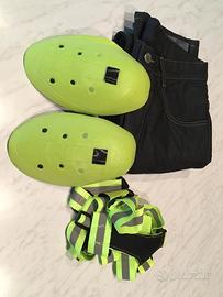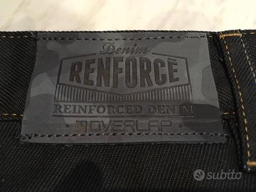 Jeans modello Overlap Street Kerosene, taglia 31/47. Gli inserti in kevlar per evitare abrasioni sono segnati in giallo nell'immagine. Ideali per un uomo di altezza intorno a 180-185 cm relativamente magro. Non li ho mai usati perchè hanno la gamba un po' troppo lunga per me. Sono incluse anche le protezioni per le ginocchia da inserire e disinserire a piacimento, e in omaggio anche un nastro fluorescente per la visibilità.