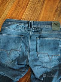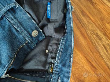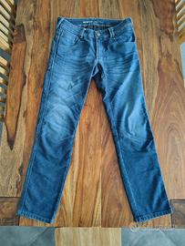 Perfetti Jeans REV'IT uomo con protezioni flessibili omologate alle ginocchia (protezioni See Smart) ed inserti anti abrasione nei punti più esposti. Misura americana 34 che corrisponde ad un 50. Non sono stati tagliati o modificati nell'orlo. Usati un paio di volte poi venduta la moto. Come si può evincere dai vai tagliandini li ho pagati circa 180 euro in sconto.