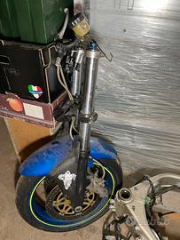 Blocco carburatori 130 forcelle ant. con piastre 220 telaietto posteriore reggisella 110, forcellone post. 95. mono ammortizzatore post. 80. ruota posteriore completa di pneumatico disco e corona 130, pinze freni ant. con pompa 90. freno post. con relativa pompe e pinza 75. comandi manubrio, pedivelle passeggero, sella, codone, serbatoio leggermente ammaccato 60. cablaggio completo di centraline ecc. 50, per altre parti prezzi da concordare.