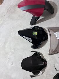 Vendo vari articoli: Terminale Scarico originale praticamente nuovo 80 Cassa di risonanza 80 Portatarga originale con frecce 80 Specchietti originali con frecce originali + frecce piccole 90 Plexi cupolini 40 cad Parafango anteriore 50 Parafango posteriore carbonio 100 Parafango posteriore puig 150 Coperture carter 100 Carena reggi strumentazione verniciata nera 40 Triangolo carena sopra sella pilota verniciato nero 40 Leva frizione originale 10 Motorino valvola di scarico 40 Monoposto da verniciare 10 Se interessati posso fare altre foto . Il terminale e cassa di risonanza ritiro a mano