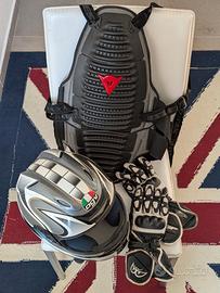 Vendo kit completo abbigliamento moto composto da: •Tuta in pelle Arlen Ness (divisibile) taglia 48, usata ma in buone condizioni generali (pr. singolo 250). •Stivali TCX numero 44, ben strutturati e ancora rigidi, normali segni di utilizzo (pr. singolo 90). •Paraschiena Dainese con protezione rigida (pr. singolo 50). •Guanti racing Berik in pelle, con slider e protezioni (pr. singolo 20). •Casco AGV taglia S, senza visiera (pr. singolo 10). Ideale per chi cerca abbigliamento tecnico completo a prezzo contenuto oppure per uso pista/ricambi. Vendita in blocco (370) o singolo su disponibilita'.