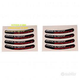 (R.23618) Vendo serie di 4 adesivi per i cerchi nuova per Peugeot Speedfight con codice 753059 con scritta silver sport di colore argento e rosso su sfondo nero , lunghezza 74 mm , altezza 9 mm , il kit si intende per foglio con quattro adesivi , per istruzioni e applicazioni vedere foto