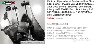 Vendo per errato acquisto kit attacchi marca Biondi, codice 8500705, per schermi parabrezza marca Biondi (Linea Club/LittleClub/Z.. – PIAGGIO Vespa LX 50/125/150cc. 2005-2007, Beverly 125/200cc.- 2001-mag03, Liberty I-GET 50-/125/150cc. 2016, Liberty RST 50/125/200cc. 2004, Liberty S 50-/125/150cc. 2016, Liberty S 50-2T/50-Piaggio Vespa LX 50/125/150, Liberty, Liberty S e Beverly). Sistema di fissaggio in acciaio, solido e di facile montaggio. Prodotto nuovo e completo di istruzioni di montaggio e confezione originale. Non adatto per schermo originale Piaggio Vespa LX pertanto, prima di procedere all'acquisto, verificare la compatibilità con gli schermi marca Biondi.