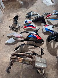 Vendo carene per BMW M 1000RR tutto il kit completo più faro anteriore, semi manubri, scarico completo con terminale, pedaline. Alcuni danni da caduta come in foto. Per altre foto contattare.
