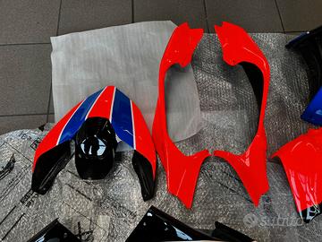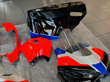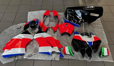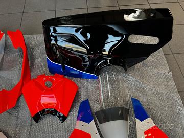 Kit composto da: cupolino, ali destra e sinistra, supporto ali interno in aviofibra, plexiglass, fianchi destro e sinistro, codino, fianchetti codino destro e sinistro, vasca e cover serbatoio.