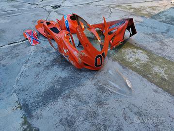 Vendo kit carene completo in vtr con anche il copriserbatoio in vtr verniciato arancione e con adesivi "Generale Lee" per suzuki gsx-r 600 / 750 k6 /k7. Il kit comprende anche il cupolino doppia bolla e la parte di neoprene che simula il sellino. Sulla fiancata destra sono presenti dei graffi (no crepe) causa piccola caduta in ghiaia. Vendo il kit completo e non i pezzi singoli. Ritiro solo a mano, non spedisco.