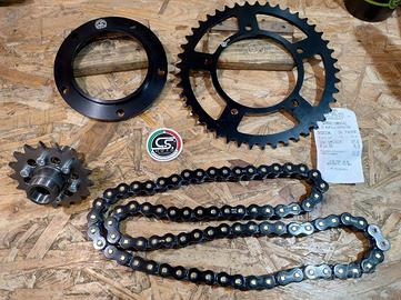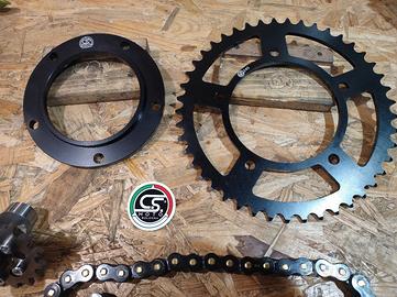 KIT trasmissione catena per Tmax 530 anno 2012-2016 praticamente come nuovo montato solo per prova . Catena rk zxw Black bellissima e silenziosa già pronta da montare , pignone completo da 17 denti, corona nera da 45 denti più flangia nera allineamento catena. Tutto pronto per installazione senza apportare modifiche.