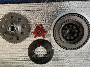 Si tratta di una frizione STM EVO-SBK, realizzata in alluminio dal pieno con campana e pacco dischi da 48 denti; i dischi sono 9 condotti e 9 guarniti con diametro di 138 mm.