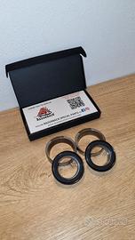 Il kit comprende cuscinetti e sedi speciali per inclinare il canotto di sterzo di 1,3° senza ulteriori modifiche. Occorre solamente sostituire i cuscinetti e le sedi originali, senza altre modifiche alla moto.