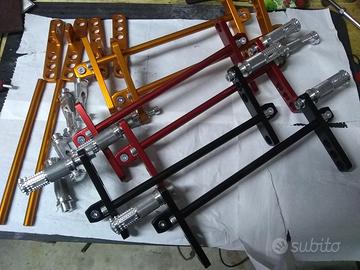 Indispensabili per una guida sportiva al 100%. Garantiscono un posizione su sella sicura e ideale. Comprese di tutta la minuteria e istruzioni di montaggio, si montano senza alcuna modifica in due modalità:classica con posizioni più avanzate o più arretrate con l'aggiunta di prolunghe centrali. Disponibili ultimi lotti fuori produzione colori