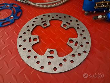 una pinza freno RPM a 4 pistoncini con staffa di ancoraggio, un disco da 200 mm, un dispositivo ABS che evita di inchiodare davanti, delle flange di spessoraggio ed un cavo idraulico da attaccare all ABS alla pompa freno con leva.