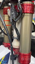 Vendo kit completo di forcelle, piastre rosse, supporto per pinza freno anteriore e mono. Condizioni ottime, appena revisionate completamente da Solva, con si vede in foto. Vendo per cambio moto