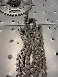 Vendo kit catena corona pignone originali nuove per Yamaha R6 2017 2018 2019 2020 2021 2022 2023 2024 . Catena passo 525, pignone 16 e corona 45 . Kit smontato da moto nuova, mai utilizzato.