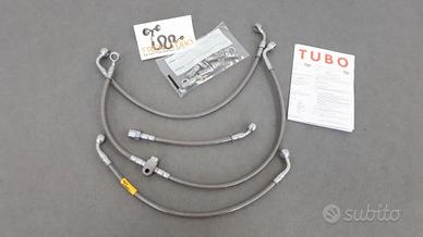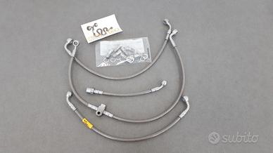 Per aumentare la capacità frenante della vostra moto eliminando il fastidioso effetto polmone dei tubi tradizionali occorre sostituire le tubazioni freno con quelli trecciate. Infatti grazie alla ridotta dilatazione volumetrica del tubo trecciato la pressione del circuito idraulico generata dalla pompa freno, non si disperde lungo la tubazione ma agisce in modo più diretto sulle pinze freno aumentando quindi, a parità di forza, la capacità frenante. Il kit è completo di tutto il necessario per il montaggio fascette incluse e comprende sia i tubi freno anteriori che quelli posteriori (per le moto con disco posteriore), è costruito rispettando il disegno originale. Coppia Serraggio Raccordi Acciaio 20Nm Il costo non è trattabile, non chiedetelo. E' preferibile un consegna di persona, ma una eventuale spedizione con corriere costa 9euro.