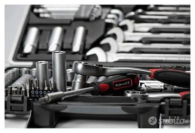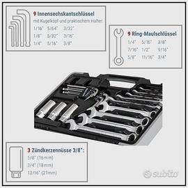 SPEDIAMO IN TUTTA EUROPAcricchetti a denti fini (72 denti)materiale di alta qualit: chiavi combinate, chiavi a brugola e dadi in acciaio al cromo vanadio di alta qualit con superfici finemente satinategiunti cardanici con rondelle elastiche all'interno dei giunticombinazione ben studiata: le punte in pollici per viti a stella interna (T), a croce e ad esagono cavo sono raggruppate in portapunte separati e rimovibili per evitare eventuali smarrimentiBussole esagonali con attacco laterale: tutte le bussole esagonali con attacco laterale che facilita la rimozione delle viti gi danneggiateContenuto 1/4":1 cricchetto reversibile da 1/4" con sistema di bloccaggio1 ginocchiera 1/4" 110 mm1 prolunga 1/4" 75 mm1 giunto angolare 1/4"5 bussole lunghe da 1/4" in 1/4", 5/16", 3/8", 7/16", 1/2"10 bussole 1/4" in 5/32", 3/16", 7/32", 1/4", 9/32", 5/16", 11/32", 3/8", 7/16", 1/2"1 cacciavite da 1/4"Contenuto 3/8":1 cricchetto reversibile da 3/8" con sistema di bloccaggio2 prolunghe 3/8": 70 mm e 150 mm1 giunto angolare 3/81 adattatore da 3/8" a 1/43 prese per candele 3/8" in 5/8" (16 mm), 3/4" (18 mm), 13/16" (21 mm)11 dadi da 3/8" in 1/2", 9/16", 19/32", 5/8", 11/16", 3/4", 25/32", 13/16", 7/8", 15/16", 1"4 bussole lunghe 3/8" in 9/16", 5/8", 11/16", 3/4"Bit:4 punte esagonali da 1/4", 9/32", 5/16", 3/8"4 punte a stella in T40, T45, T50, T553 punte a croce: PH1, PH2, PH33 punte a croce doppie: PZ1, PZ2 e PZ34 punte esagonali: 1/8", 5/32", 3/16", 1/4"6 punte a stella: T10, T15, T20, T25, T30, T401 portapunte da 1/4" con 3 punte con intaglio: 5/16", 1/4", 5/321 portapunte da 3/8" con 2 punte ad intaglio: 5/16", 3/8"Chiavi:9 chiavi combinate, offset in 1/4", 5/16", 3/8", 7/16", 1/2", 9/16", 5/8", 11/16", 3/4"Set di chiavi a brugola (9 pezzi) con estremit sferica in 1/16", 5/64", 3/32", 1/8", 5/32", 3/16", 1/4", 5/16", 3/8" con pratico supportoBuono a sapersi:Una cassetta degli attrezzi Rothewald come q