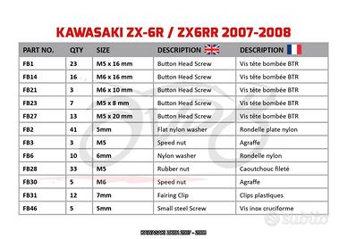 Un ottimo kit aggiuntivo per rimontare gran parte delle tue carene in caso di smarrimento o sostituzione di alcune viti. Una descrizione completa e numerata, che elenca tutte le parti fornite in questo kit e ti mostra a che livello usarle sulla tua bella, vi sarà fornita per facilitare l'uso.
