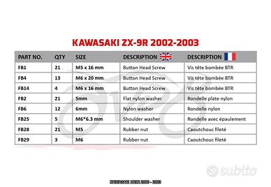 Un ottimo kit aggiuntivo per rimontare gran parte delle tue carene in caso di smarrimento o sostituzione di alcune viti. Una descrizione completa e numerata, che elenca tutte le parti fornite in questo kit e ti mostra a che livello usarle sulla tua bella, vi sarà fornita per facilitare l'uso.