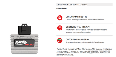 Vendo centralina aggiuntiva RAPID BIKE SMART 2 per Kove 800x, incrementa e addolcisce drasticamente l'erogazione sotto i 5500giri, tre tipi di mappature regolabili su 20 livelli, adatta per moto sia originale che con scarico modificato. Taratura in tempo reale tramite App dal telefono. La vendo perchè ho fatto una drastica elaborazione dell'elettronica ed oramai per me è superflua. Prezzo 200€ spedizione compresa.