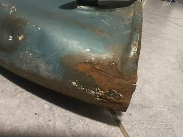 Coppia cofani dell'epoca, nel corso del tempo rivernciati, di facile restauro, completi di fregi, una scritta da saldare e ganci, in foto il punto che richiede punti di saldatura cofano lato destro accensione.