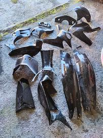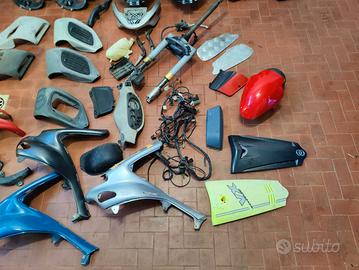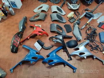 come da titolo vendesi lotto di ricambi per Gilera runner 125/180 2t, i rcambi sono in buone condizioni: - 1 forcella con pinza freno (con tubo, vaschetta e leva, 90 euro) - 1 sottosella (30 euro cadauno) - 2 retroscudo forcella (30 euro cadauno) - 1 plastica portatarga (60 euro) - 5 plastiche prese d'aria (2 grigie 20 euro, 2 grigio scuro 35 euro, 1 nera con simbolo gilera 20 euro) - 1 vaschetta espansione (20 euro) - 1 carene frontale gialla (25 euro) - 5 carene laterali anteriori (2 azzurre 60 euro, una nera sx 25 euro, una rossa dx 25 euro, una grigia sx 30 euro) - 2 serbatoi benzina (25 euro cadauno) - 2 pedane in mandorlato (30 euro) - 2 pedaline passeggero (30 euro) - 2 plastiche manubrio (regalo con ordini superiori a 200 euro) - 1 cablaggio completo (50 euro) - 1 kit carene nere (150 euro) Molti ricambi probabilmente li ho dimenticati, chiunque acquisti il blocco, regalo i ricambi non menzionati, spedizione prevista per ordini superiori a 50 euro, ritiro a mano con visione di tutti i ricambi nettamente preferito. È prevista anche la vendita in blocco per 350 euro NON trattabili.