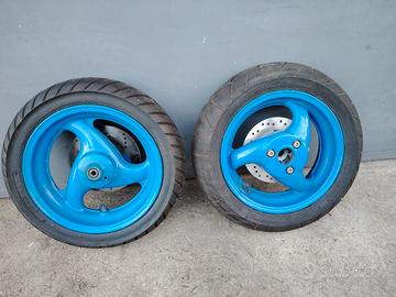 Vendo come in foto, cerchi completi di gomme e dischi freno, disco freno posteriore nuovo, misure 120 70 12 / 130 70 12,