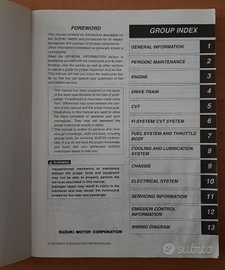 Vendo manuale di servizio, in lingua inglese, per Suzuki Burgman AN 650. Acquistato per modello (2002 -03), utilizzato per generazioni successive (2004 - 06) e (2006 - 12). Completo ed in ottime condizioni.