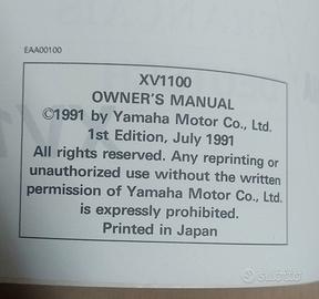 Vendo Manuale uso e manutenzione Yamaha XV 1100 prima edizione del 1991. contiene anche lo schema dell'impianto elettrico. Esteticamente in ottime condizioni praticamente ma sfogliato. Integro co in normali piccoli segni sulla copertina dei 35 anni trascorsi (qualche microscopica macchia). Scritto in multi lingue