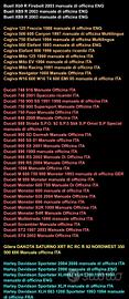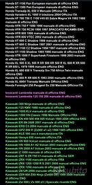 Manuali di tutte le marche ed epoche in lingua italiana inglese spagnolo francese e tedesco a seconda del modello di moto e scooter di riferimento , lista modelli moto e scooter e tipo di manuali in foto ( o su vostra richiesta tramite messaggio sul sito o su WhatsApp per un modello specifico non presente in lista ) . I manuali in formato elettronico PDF o raccolta JPEG in formato zip, vi verranno inviati dopo pagamento , su vostro indirizzo e.mail o a scelta su WhatsApp . 10 euro per i manuali di uso e manutenzione 15 euro per i manuali di officina .
