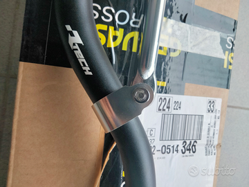 Vendo manubrio nero racetech nuovo, mai montato, con parte centrale 28mm, estremità 23mm dotato di traversino e paracolpi per moto da enduro/cross con piega David K. (Vedere foto per le specifiche sulle angolazioni ed altezze del manubrio David K.) nella confezione originale.