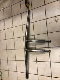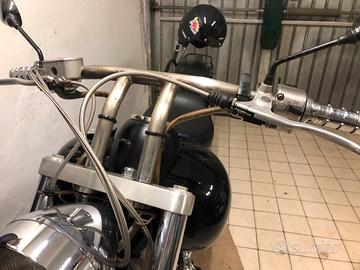 Manubrio custom t-bar rat style. Era montato su Yamaha Dragstar 650. Finitura rat-style, spazzolata e arrugginita, oppure da verniciare o cromare. Diametro grosso con riduzione nelle leve e manopole. Harley Dragstar Shadow Vulcan