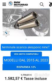 [OCCASIONE PER VENDITA MOTO PREZZO REALIZZO] SCARICO TERMINALE MARMITTA AKRAPOVIC ORIGINALE BMW MOTORRAD DI PRIMO EQUIPAGGIAMENTO PER MODELLI R 1200 NINET DAL 2015 AL 2023 CHI INTERESSATO MANDI CELL PARI AL NUOVO NO PERDITEMPO preferita consegna breve mani, POSSO SPEDIRE previo accordi e pagamento diretto + spedizione 20 EURO assicurata corriere SDA LEGGEREZZA E SOUND INCONFONDIBILI SI ADATTA SU ALTRI MODELLI R GS BI ALBERO Terminale Akrapovic modello Slip On omologato specifico per BMW R12 e R12 Nine T. Questo terminale della Akrapovic rappresenta uno degli oggetti più ricercati per una moto grazie all'elevata qualità costruttiva unita alla ricerca maniacale delle prestazioni. Lo scarico Slip On è stato progettato per accoppiarsi ai collettori originali e vi permetterà quindi un facile montaggio e grande affidabilità nel tempo. Il terminale ha un doppio scarico con fodero in acciaio naturale con serigrafia AKRACOPOVIC. Questo terminale vi garantirà un aumento delle prestazioni ai medi ed alti regimi