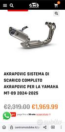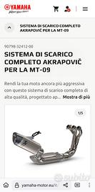 Vendo Marmitta Scarico Akrapovic completo Originale Yamaha per MT 09 2021/2023 (dedicato a Yamaha per MT 09) come da foto completo di tutto compresa omologazione. Praticamente nuovo senza segni di usura. Spedisco con il suo imballo originale. Prezzo leggermente trattabile, vedete il prezzo di acquisto in foto. Minimo prezzo che si trova in giro è di 1600 euro. Non sognatori. Per altre foto e/o informazioni contattatemi pure