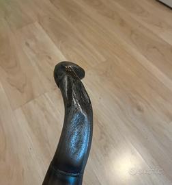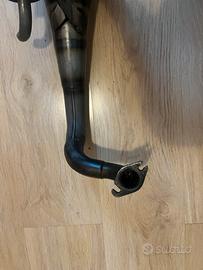 Marmitta stage 6, appena restaurata, purtroppo presenta un’ammaccatura come da foto, tuttavia questa non é visibile da montata e non ne compromette le prestazioni. É stata lunidata, ne sono state ripassate le saldature e infine l’ho verniciata con smalto ad alte temperature.