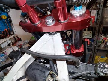 Marzocchi magnum con steli da 50 mm completa di piastre in alluminio cnc per africa twin 750 monta con doppio disco anteriore con i suoi distanziali e le pinze originali.