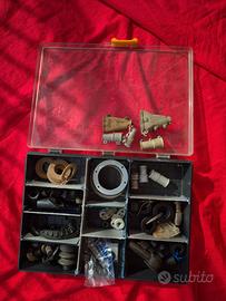 Sportello in lamiera vano carburatore. 3 contenitori con materiale vario tra cui prese in bachelite, puntine nuove d'epoca, passa guaine, viteria varia anche cromata, cuscinetti e cortechi, devio luci vari anche per moto, un portapacchi, 2 gomme nuove , un carburatore SI2424E, e tutto ciò che non è visibile. Come attrezzatura chiudi bordo scudo, schiaccia rivetti, attrezzatura artigianale per la taratura del volano, blocco mozzo ruota, chiave smontaggio rubinetto benzina, pistola da compressore tipo verticale nuova, per smontaggio in particolare frizioni, ed altro. A richiesta invio foto, in quanto impossibile inserirle in questa inserzione.
